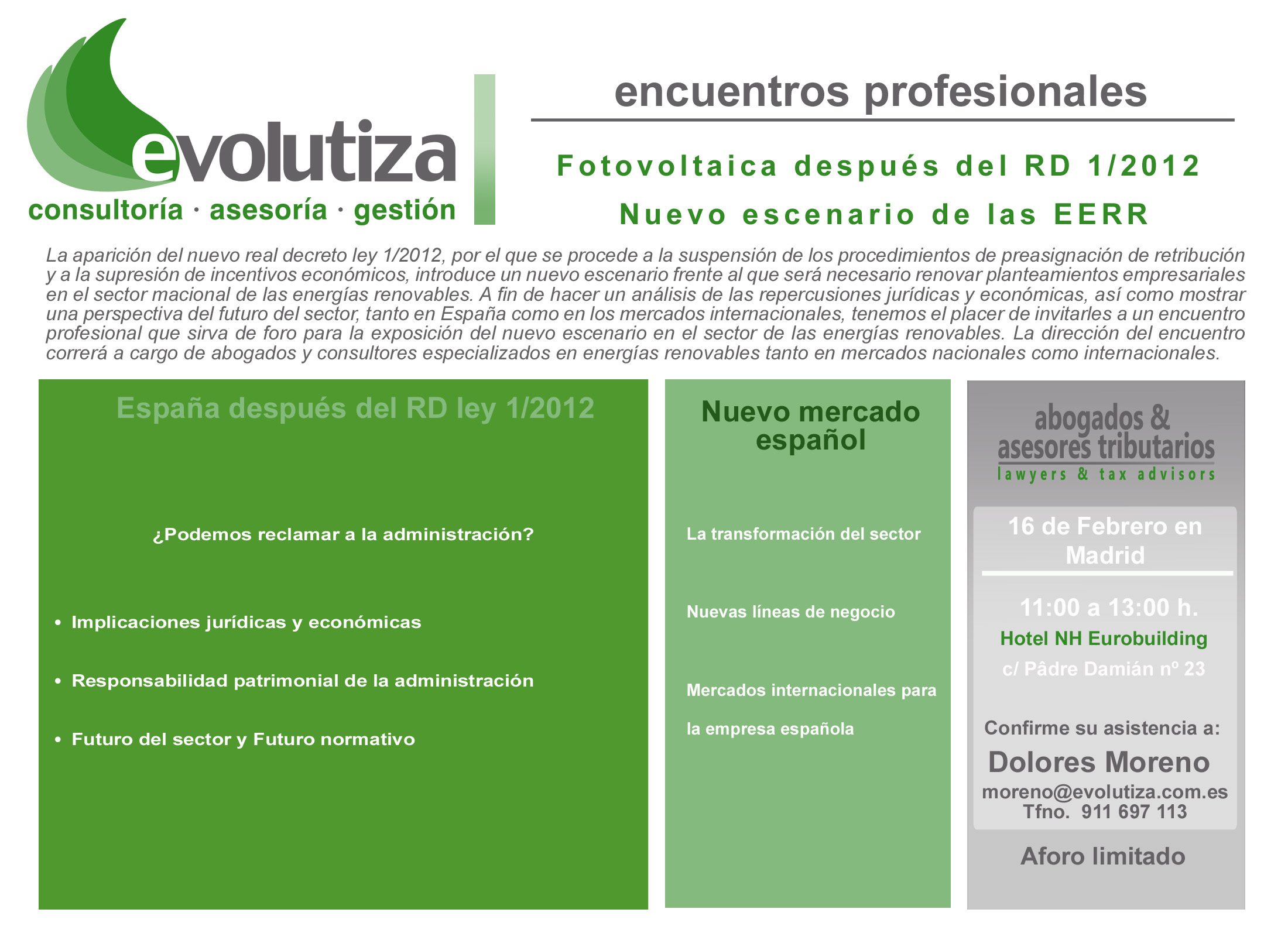 The entering into force of the new Executive-Law to proceed to the suspension of pre-allocation procedures and the removal of economic incentives introduces a new stage in renewable energy field that will make necessary to renew the business activities. In order to expose the legal and economic implications, as well as showing an overview of the sector’s future, both in Spain and in international markets, Evolutiza Lawyers & Tax Advisors will conduct a professional meeting as a forum for the exhibition of the new stage in the renewable energy sector, which will set out the rights that protect investors and developers involved, the liability of the administration, the industry’s future and the future policy, and new lines of business and international markets interesting for the Spanish company.
